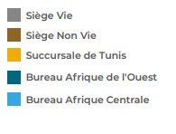 Quatre centres de production animent l’activité de la Compagnie : le Bureau Régional d’Abidjan, le Bureau Régional de Douala, la Succursale de Tunis et le Siège à Lomé qui abrite la Direction des Opérations Vie et la Direction Centrale de la Production Non Vie (DCPNV).